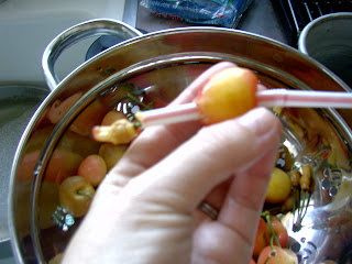 For some reason, I had my fill of the cherries and decided I would share "my" cherries with the boys, but had to pit them quickly (didn't want to spend all day on it like when I was shelling peas, arghh) and frugally (I wasn't going to buy a gadget). I confess the truth, I waited until my husband was out with one of the boys so I only had to share them with the other boy, but I did pit them first. Good mommy!